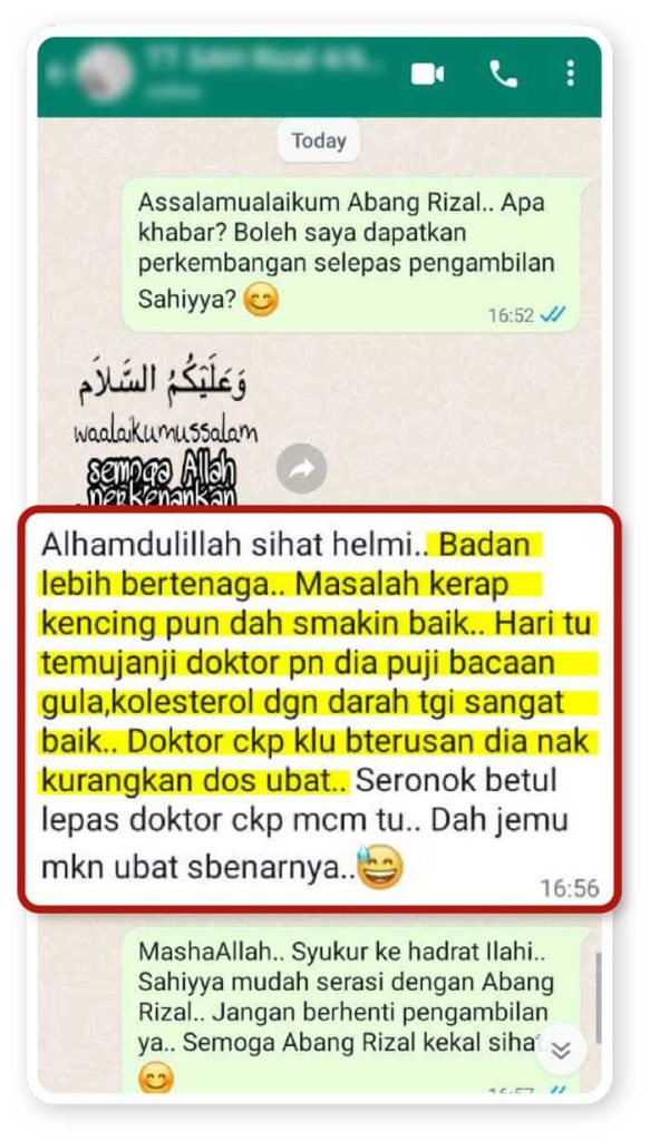 Salam. Saya dah amalkan sahiyya hampir 3 minggu dan dapati perubahan dalam diri saya. Air kencing ada kurang buihnya dan pinggang pun kurang sakit.