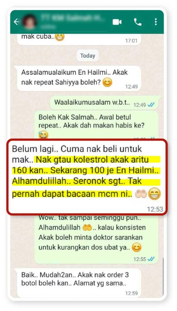 Bacaan kolesterol dah turun dari 160 ke 100