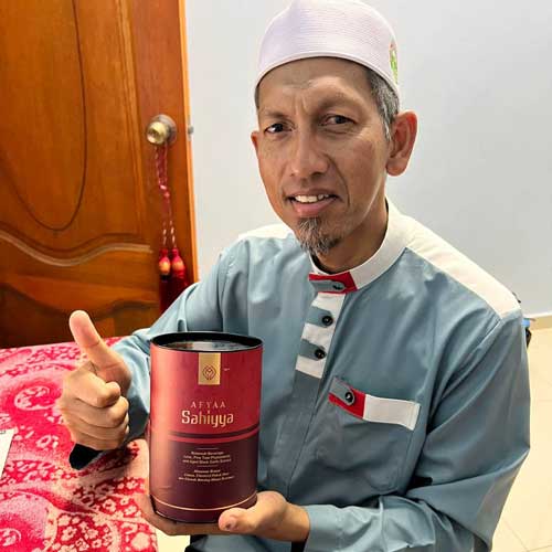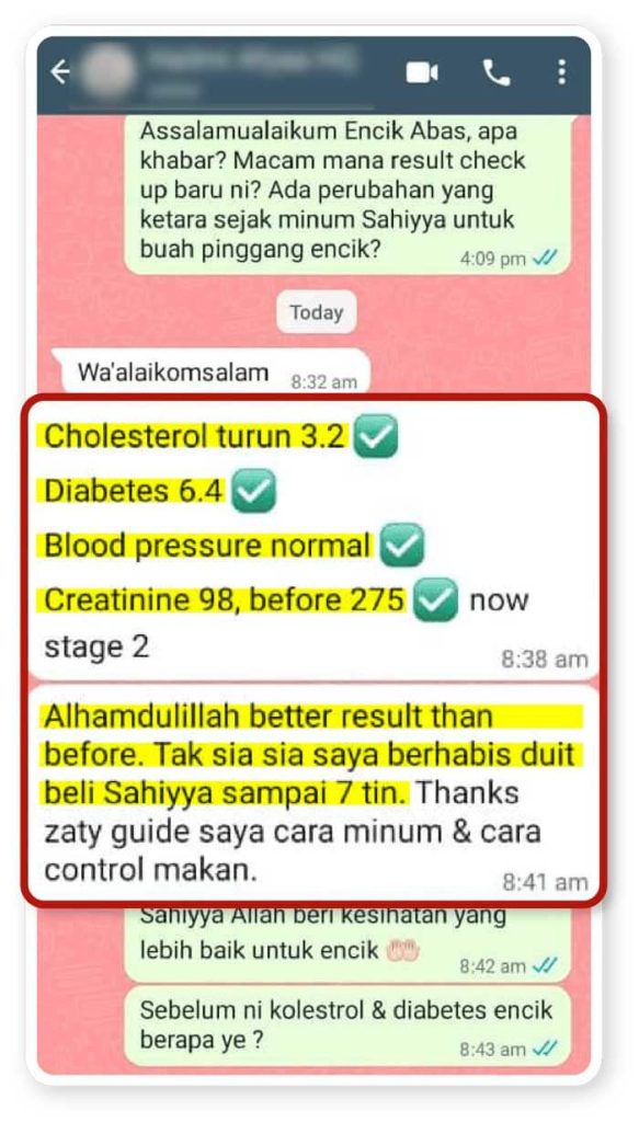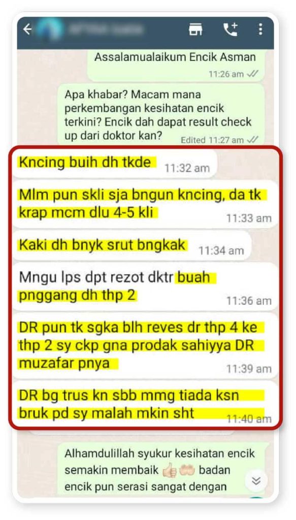 “Alhamdulillah, selepas amalkan selama sebulan, buah pinggang dari tahap 4, skrg dah jadi tahap 2 je… Kaki pun dah tak bengkak dan saya semakin bertenaga “
