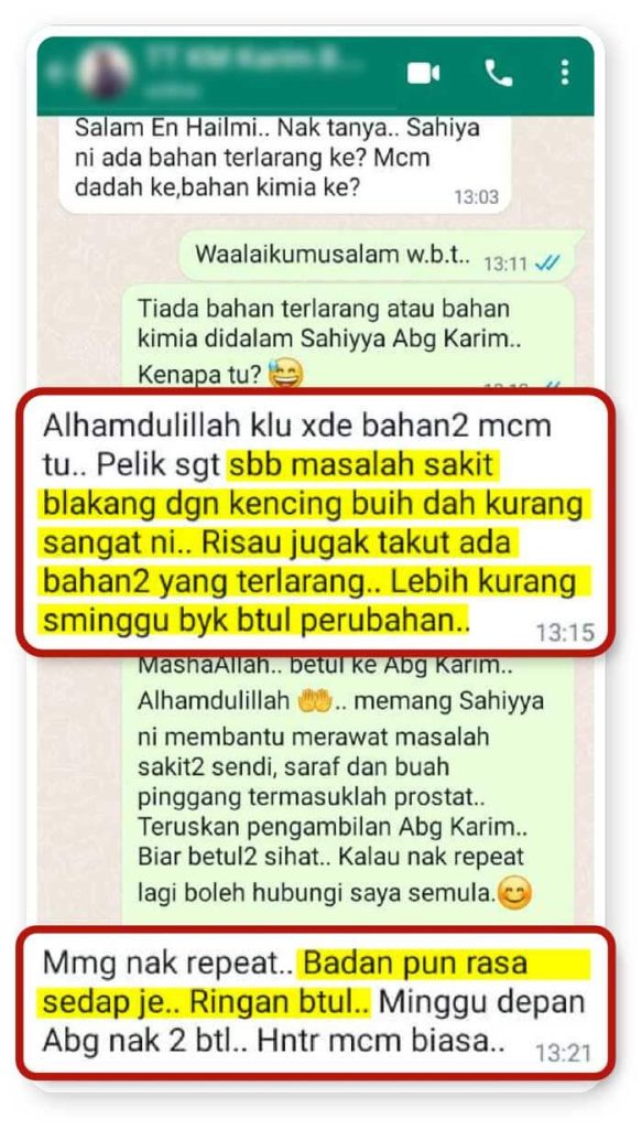 Salam. Saya dah amalkan sahiyya hampir 3 minggu dan dapati perubahan dalam diri saya. Air kencing ada kurang buihnya dan pinggang pun kurang sakit. Air kencing ada kurang buihnya dan pinggang pun kurang sakit. Air kencing ada kurang buihnya dan pinggang pun kurang sakit.
