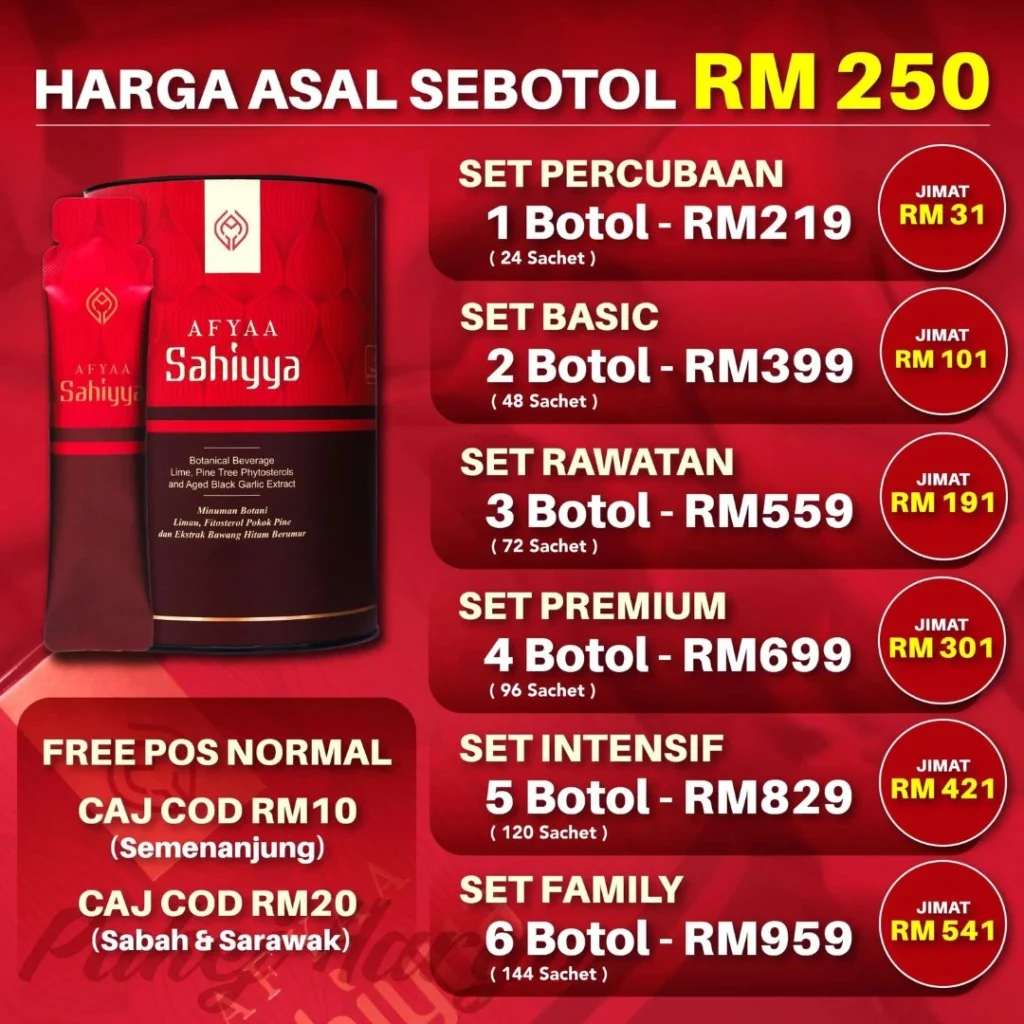 A: Kami menawarkan pakej pada harga istimewa. 1 botol hanya RM219. 2 botol hanya RM399. Anda boleh rujuk senarai harga dan pakej disini: